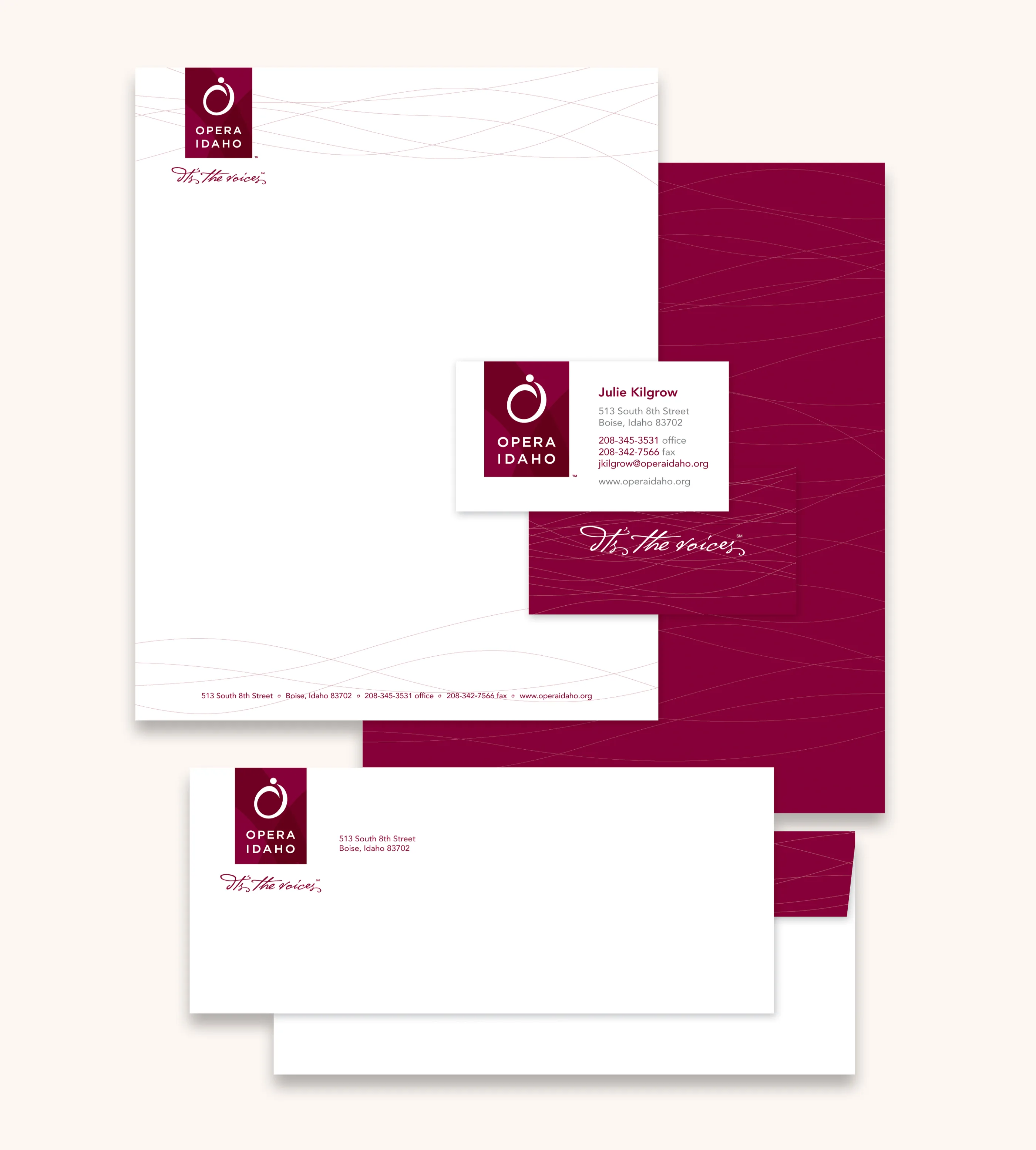 The new identity is progressive, historic, and unified. The strength and simplicity combines feminine and masculine characteristics to yield a brand that conveys both integrity and emotion. It has been derived from several different elements including the letter forms “O” and “I” and influenced by several musical symbols and notes such as the fermata. The variation of a single color represents the complexity and range of the voices. It is a convergence of royalty (purple) and passion (red). The typeface is strictly representative of strength and stability of Opera Idaho and has a long history of use in sign design in New York City and the arts. The tagline compliments the mark with a sense of artistic flair.